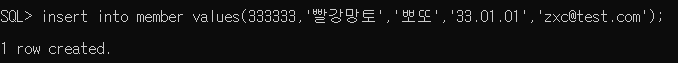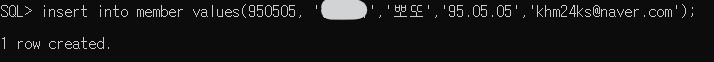 insert into member values(950505, '성명','뽀또','95.05.05','khm24ks@naver.com'); -->성명은 이름입니다.