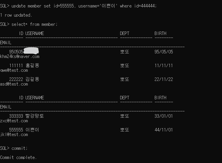 -->member 을 수정, id칼럼의 값을 555555로, username을 '이쁜이'로 변경한다. 변경대상은 id가 444444인 직원