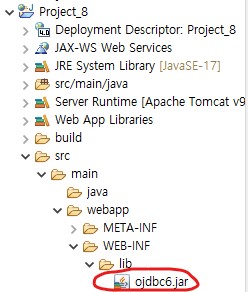 위의 순서대로 들어가서 ojdbc6.jar 를 복사한 후 생성한 프로젝트의 webapp폴더- WEB-INF폴더- lib폴더 안에 붙여넣어주면 아래의 화면처럼 들어간걸 확인 하실 수 있습니다.