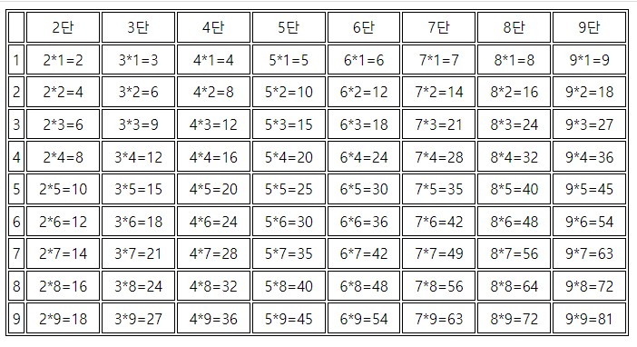 <td><%=i+"*"+j+"="+(i*j)%></td><%}%>